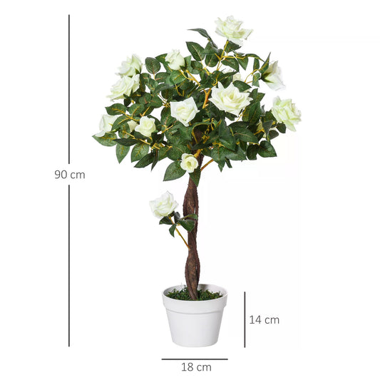 Outsunny 90cm/3FT Artificial Rose Tree Fake Decorative Plant with 21 Flowers Pot Indoor Outdoor Faux Decoration Home Office Decor White & Green
