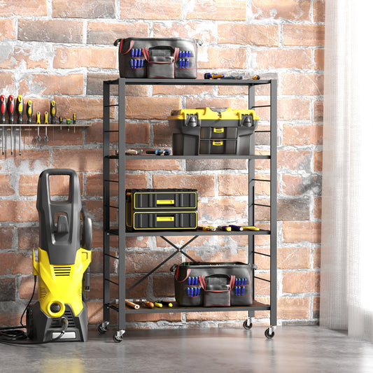 4-Tier Folding Storage Rack Metal Shelf Organizer with Wheels-Black