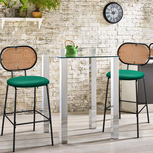 Set of 2 PU Leather Bar Stools with Rattan Backrest and Footrest-Green