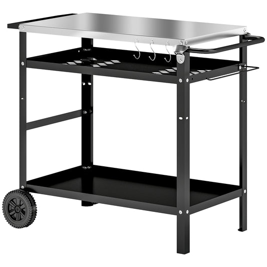Outsunny Outdoor Grill Dining Cart 2-Shelf Movable Pizza Oven Table Stand with Stainless Steel Top, Portable BBQ Trolley Food Prep Outdoor Kitchen BBQ Station with Hooks Wheels Handle, Charcoal Grey