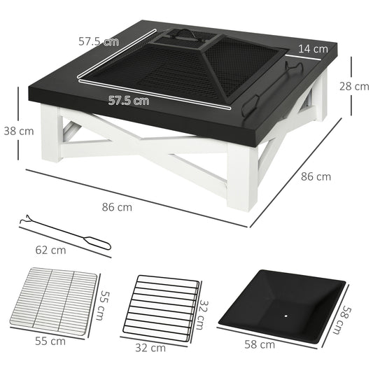 Outsunny 3 in 1 Square Fire Pit Square Table Metal Brazier for Garden, Patio with BBQ Grill Shelf, Spark Screen Cover, Grate, Poker, 76 x 76 x 47cm