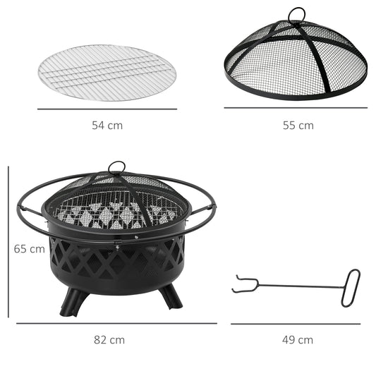 Outsunny Outdoor Fire Pit, Metal Round Firepit Bowl, Charcoal Log Wood Burner with Screen Cover, Poker for Patio, BBQ, Camping, 64 x 64 x 58cm, Black