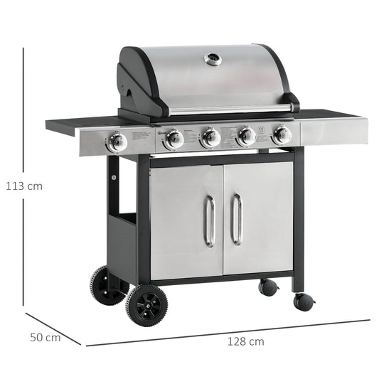 Outsunny Gas BBQ Gas Grill Barbecue 3+1 Burner Garden BBQ Trolley with Side Burner Warming Rack Side Shelves Storage Cabinet Piezo Ignition 110x50x100cm