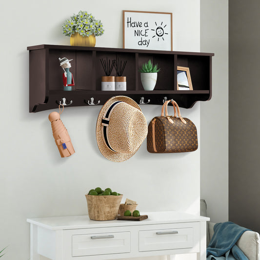 Wall-Mounted Coat Hooks with Shelf for Entryway-Brown