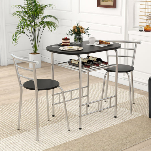 3-Piece Dining Table Set with Extra Wine Rack and Metal Frame-Black & Silver