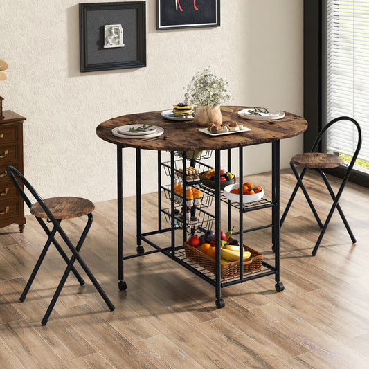 3 Pieces Drop-Leaf Rolling Dining Table Set with 2 Shelves-Brown