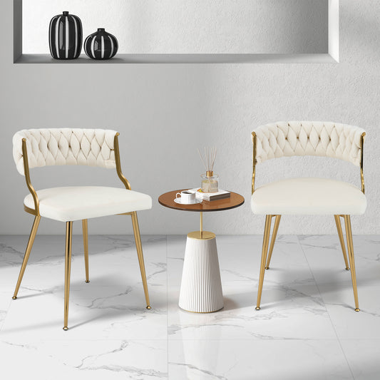 Set of 2 Velvet Dining Chair with Metal Legs and Woven Back-White