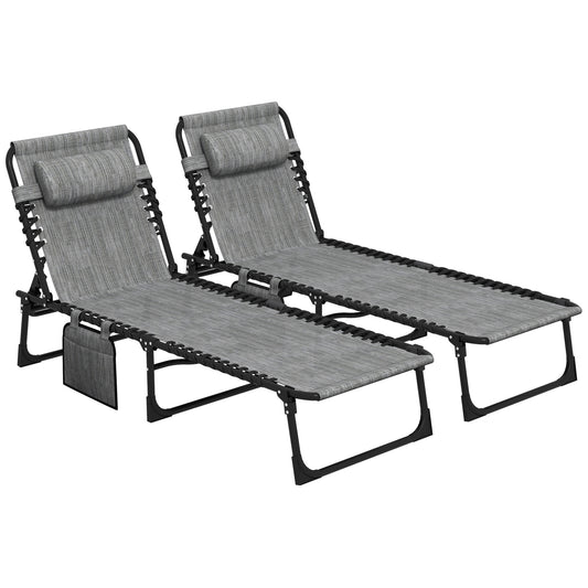 Outsunny Portable Sun Lounger Set of 2, Folding Camping Bed Cot, Reclining Lounge Chair 5-position Adjustable Backrest with Side Pocket, Pillow for Patio Garden Beach Pool, Mixed Grey