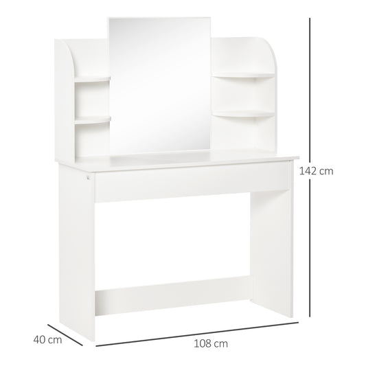 HOMCOM Modern Dressing Table Writing Desk with Mirror, Big Drawers, 2-Tier Open Shelf For Home Bedroom White