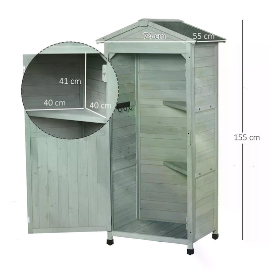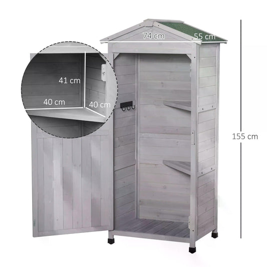 Outsunny Wooden Garden Cabinet 3-Tier Storage Shed 2 Shelves Lockable Organizer with Hooks Foot Pad 74 x 55 x 155cm Light Grey