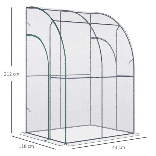 Outsunny Walk-In Greenhouse Lean to Wall Tunnel Greenhouse with Zippered Roll Up Door PVC Cover Sloping Top, 143 x 118 x 212 cm