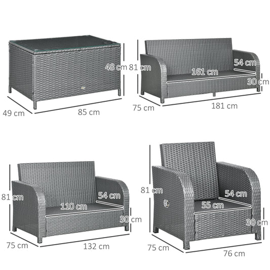 Outsunny 7 Seater Outdoor Rattan Garden Furniture Sets with Wicker Sofa, Reclining Armchair and Glass Table, Grey
