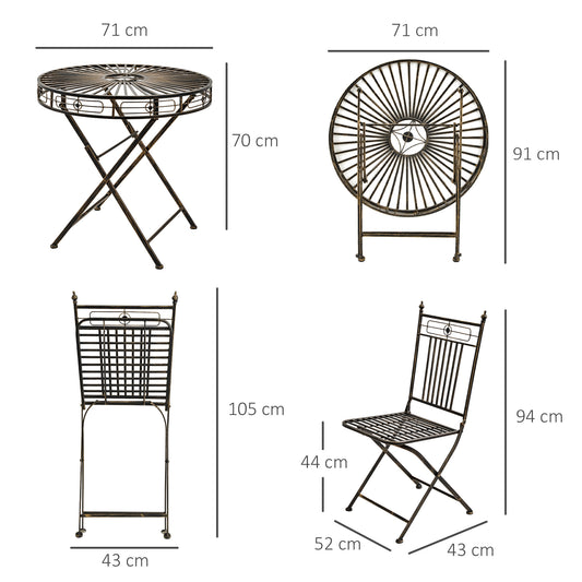 Outsunny 3 Piece Garden Outdoor Bistro Set with 2 Folding Chairs and 1 Folding Round Table, Metal Frame for Lawn, Backyard and Porch, Bronze