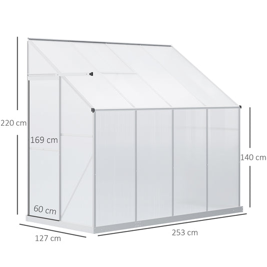 Outsunny Walk-In Lean to Greenhouse Garden Heavy Duty Aluminium Polycarbonate with Roof Vent for Plants Herbs Vegetables, Silver, 253 x 127 x 220 cm