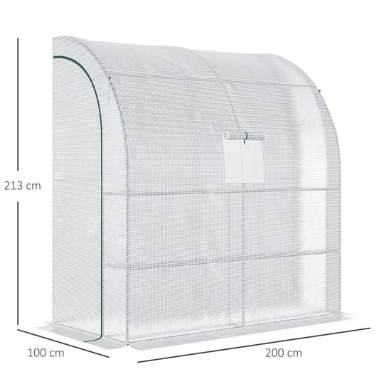 Outsunny Walk-In Lean to Wall Greenhouse with Windows and Doors 2 Tiers 4 Wired Shelves 200L x 100W x 213Hcm White