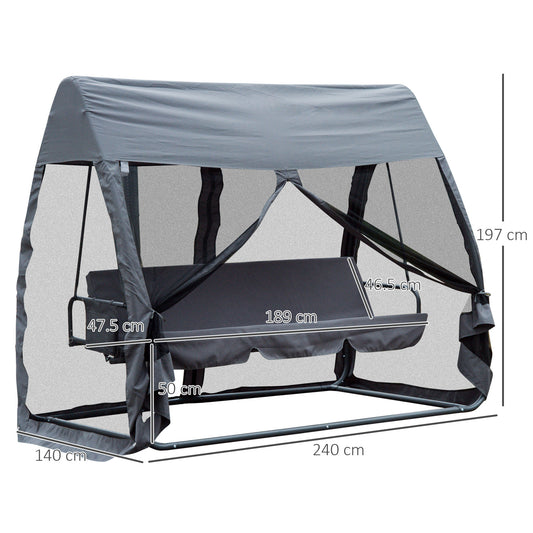 Outsunny 3 Seater Garden Swing Chair 2 in 1 Convertible Outdoor Rocking Bench Bed with Water-Resistant Roof, Zipped Door and Mosquito Netting, Grey