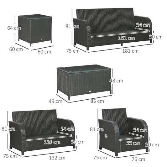 Outsunny 7 Seater Outdoor Rattan Garden Furniture Sets with Wicker Sofa, Reclining Armchair and Glass Table, 181x75x81cm, Black