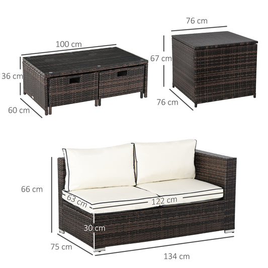 Outsunny 4-Seater Rattan Garden Furniture Patio Sofa Set Storage & Table Set with 2 Drawers Coffee Table & Corner Sofa, Brown