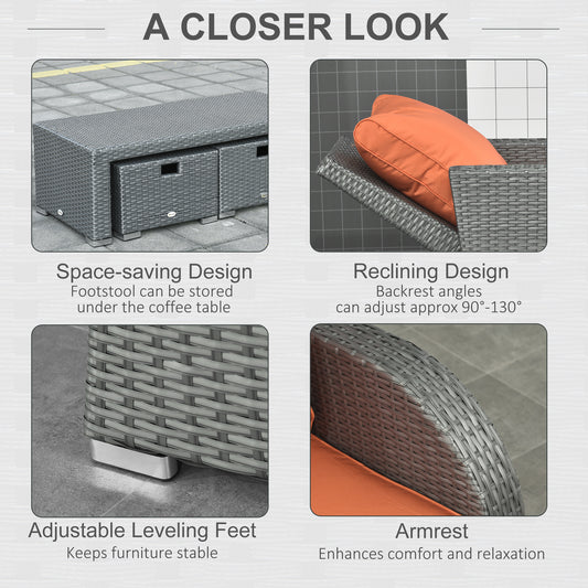 Outsunny 6pc Outdoor Rattan Wicker Furniture Set with 3-Seat Sofa, 2 Single Sofas, 2 Footstools and Coffee Table Orange