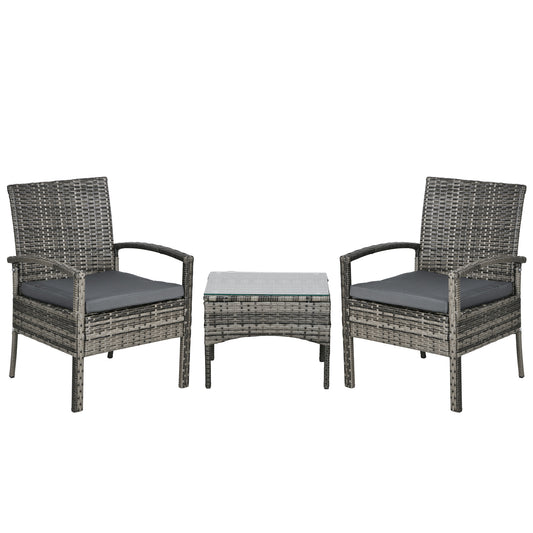 Outsunny 3 Pieces Rattan Bistro Set, Wicker Garden Furniture Set with Glass Top Coffee Table and Chairs, Washable Cushions for Outdoor, Patio, Balcony, Mixed Grey
