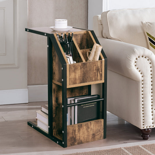 C-shape Adjustable End Table with Storage Basket-Rustic Brown