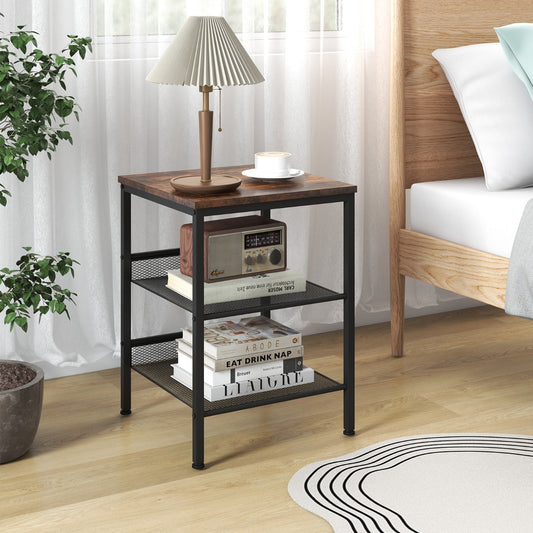 3-Tier Square End Table with Storage Cube and Mesh Shelf-Brown