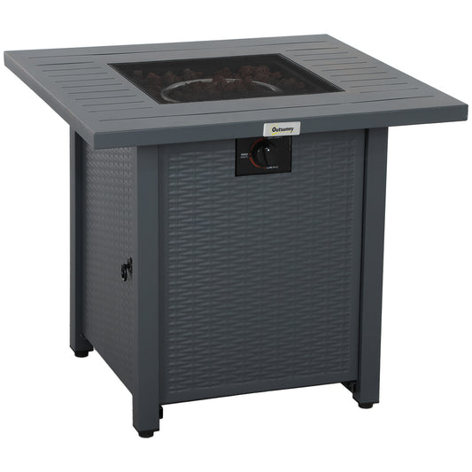 Outsunny Rattan Gas Fire Pit Table for Garden, 13 KW Smokeless Propane Fire Pit with Lid, Square Garden Coffee Table with Patio Heater for Outdoor, Patio, 58 x 58 x 33 cm, Grey