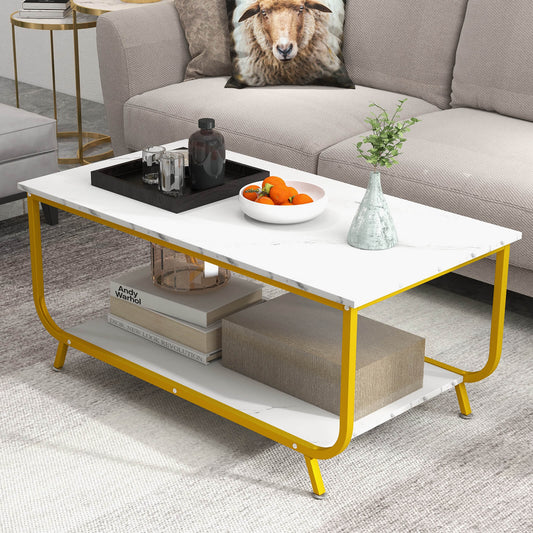 2-Tier Faux Marble Coffee Table Rectangular with Shelf-White