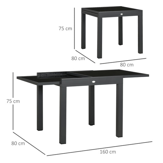Outsunny Extending Garden Table, Outdoor Dining Table with Aluminium Frame and Tempered Glass Tabletop, 80/160 x 80 x 75 cm, Black