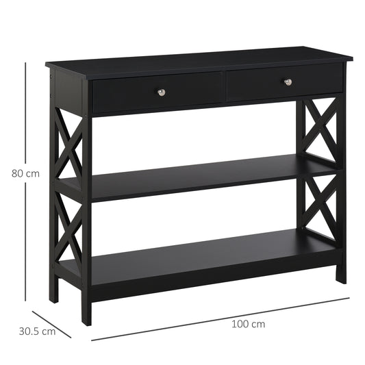 HOMCOM Console Table Side Desk with Shelves Drawers Open Top X Support Frame Living Room Hallway Home Office Furniture Black