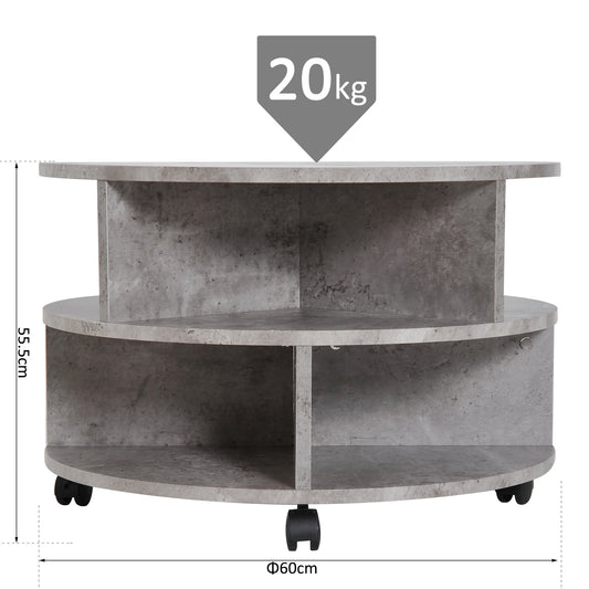 HOMCOM 2 Tier Round Side End Table Coffee Desk with Divided Shelves Tea Table Storage Unit Living Room Organiser with Wheels - Cement colour