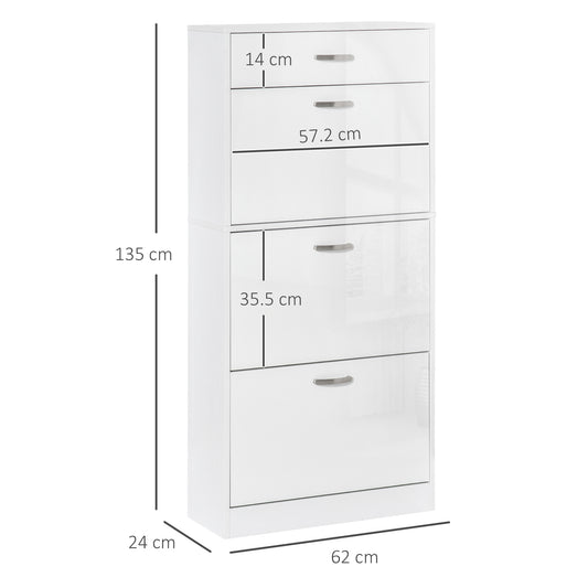 HOMCOM Shoe Cabinet with 4 Drawers Storage High Gloss Cupboard with Flip Doors Pull Down Furniture Unit with Adjustable Shelves for 18 Pairs White