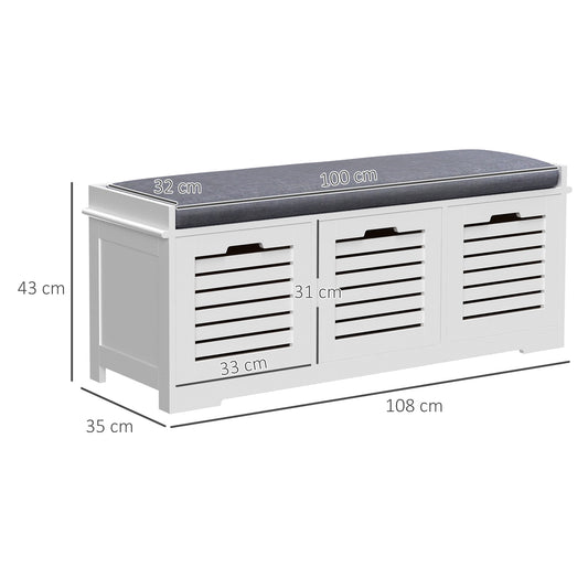 HOMCOM White Storage Bench with 3 Drawers & Removable Grey Seat Cushion Hallway Organisation furniture