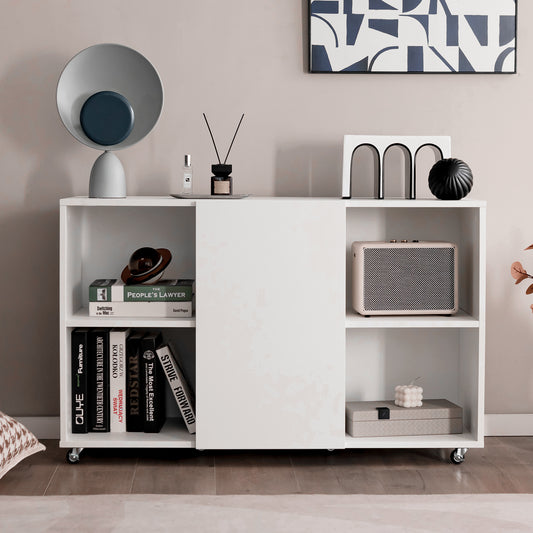 Wooden Rolling Storage Cabinet with 6 Compartments for Home Office -White