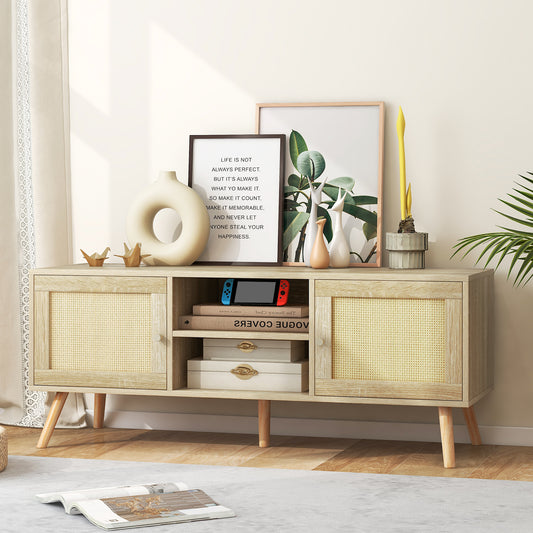 Boho TV Stand Media Console Table with 2 Cabinets and Open Shelf-Natural