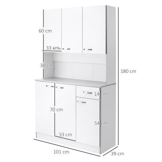 HOMCOM Kitchen Cupboard, Freestanding Kitchen Storage Cabinet with 6 Doors, Drawer, Adjustable Shelves and Open Countertop for Dining Room, White
