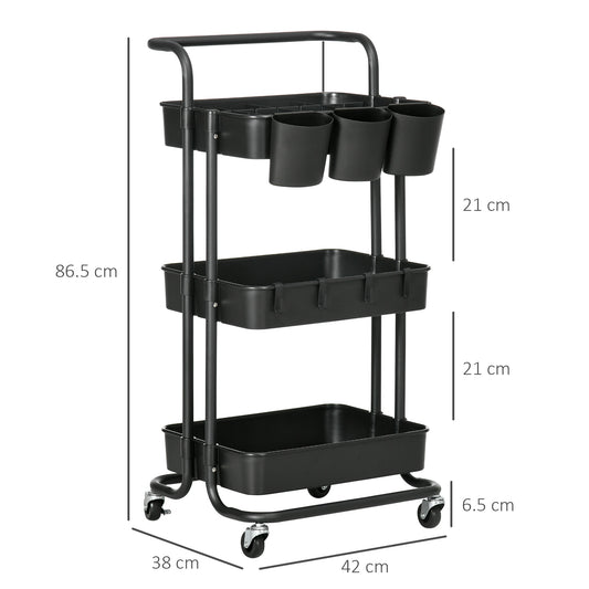HOMCOM 3 Tier Utility Rolling Cart, Kitchen Cart with 3 Removable Mesh Baskets, 3 Hanging Box, 4 Hooks and Dividers for Living Room, Laundry Black