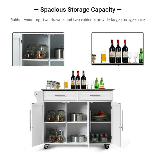 2-in-1 Kitchen Island Cart with Rubber Wood Top-White