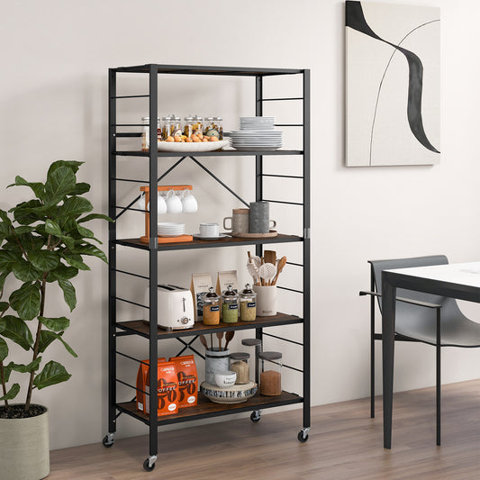 5-Tier Foldable Shelving Unit Metal Shelves with Detachable Wheels-Natural