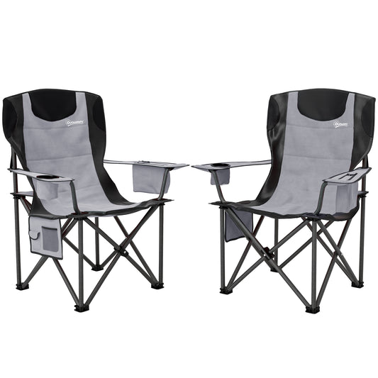 Outsunny Set of 2 Folding Camping Chairs, Padded Camping Chairs with Adjustable Armrests, Portable & Lightweight Folding Camp Chair with Cooler Bag, Cup Holder and Side Pockets, Grey