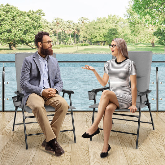 Set of 2 Padded Folding Chair with Cup Holder for Beach Lawn Yard -Grey