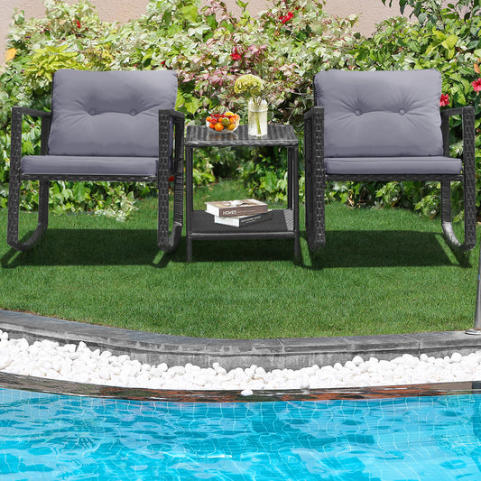 3 Pieces Outdoor Rocking Bistro Set PE Rattan with Cushions-Grey