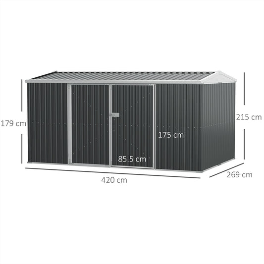 Outsunny 14 x 9 ft Lockable Garden Shed Large Patio Roofed Tool Metal Storage Building Foundation Sheds Box Outdoor Furniture, Grey
