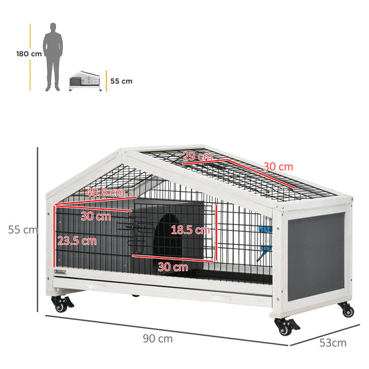 PawHut Wooden Rabbit Hutch Guinea Pigs House Bunny Small Animal Cage with Pull-out Tray Openable Roof Wheels 91.5 x 53.3 x 73 cm