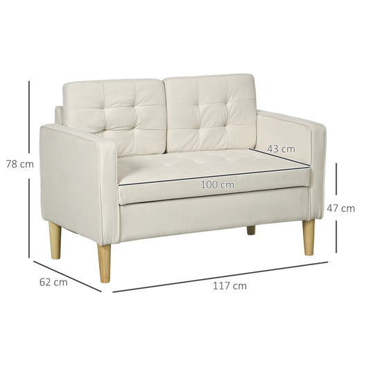 HOMCOM Modern Loveseat Sofa, Compact 2 Seater Sofa with Hidden Storage, 117cm Tufted Cotton Couch with Wood Legs, Cream White