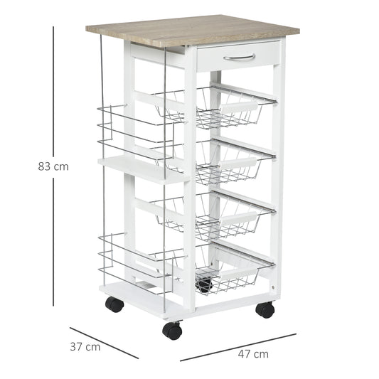 HOMCOM Drop-Leaf Kitchen Trolley with 3 Baskets Drawer Surface Top 6 Wheels Rolling Storage Unit Kitchen Home Dining Cart White Oak Tone