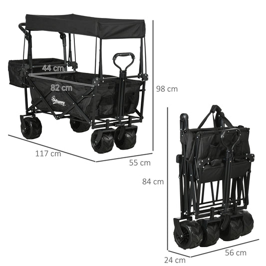 Outsunny Folding Trolley Cart Storage Wagon Beach Trailer 4 Wheels with Handle Overhead Canopy Cart Push Pull for Camping, Black