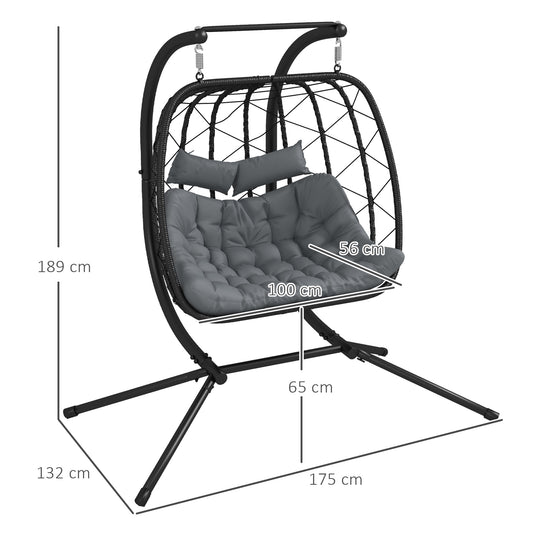 Outsunny Outdoor PE Rattan Double-seater Swing Chair with Thick Padded Cushion, Patio Hanging Chair for Two with Metal Stand, Headrest, for Indoor and Outdoor, Black