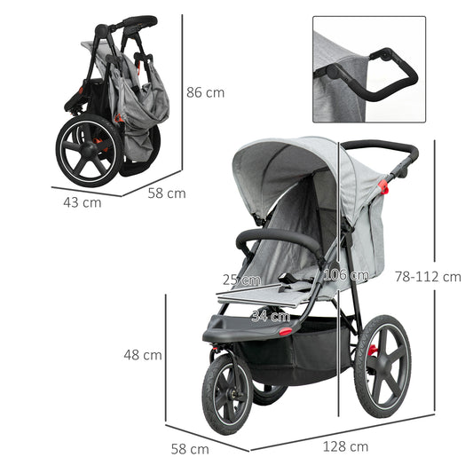HOMCOM Foldable Three-Wheeler Baby Stroller with Canopy, Storage Basket - Grey