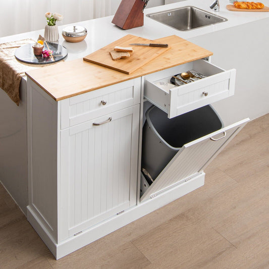 Double Tilt Out Trash Cabinet with Rubber Wood Countertop for Kitchen Dining Room-White